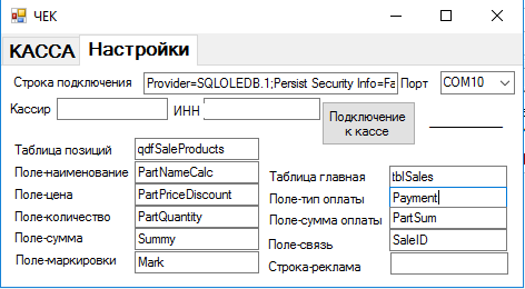 - Разовое внесение нужных настроек для подключения, а также полей, с которых берется информация в чек, с последующим сохранением
